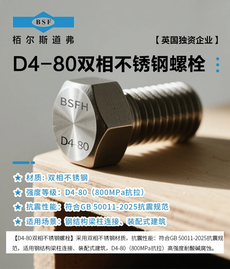 大量現(xiàn)貨 · 支持定制 · 快速發(fā)貨材質(zhì):雙相不銹鋼強度:D4-80級抗拉強度:>800MPa屈服強度:>550 MPa斷后伸長率:>15%抗震性能:符合GB 50011-2025抗震規(guī)范D4-80雙相不銹鋼螺栓產(chǎn)品優(yōu)勢超高強度性能抗拉強度可達(dá)800MPa以上,通過熱處理和冷加工工藝優(yōu)化內(nèi)部結(jié)構(gòu),顯著提升承載能力,確保重載工況下的連接可靠性卓越耐腐蝕性雙相結(jié)構(gòu)(奧氏體+鐵素體)結(jié)合高鉻含量,在含氯離子、酸性或堿性環(huán)境中形成穩(wěn)定保護(hù)膜,抗點蝕/縫隙腐蝕能力優(yōu)異